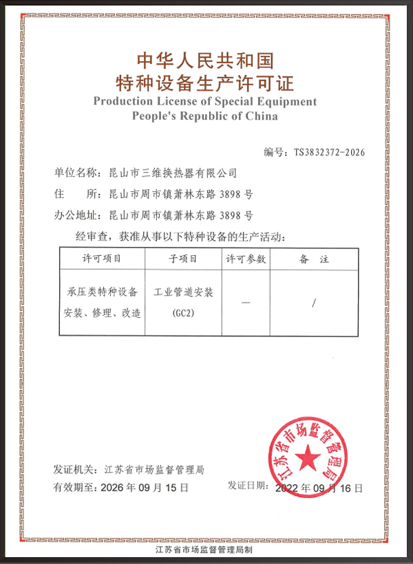 昆山市三維換熱器有限公司注冊資本5000萬元,資產2.1億元,公司地址位于江蘇省昆山市周市鎮(zhèn)蕭林東路3898號,法人代表為顧安生,公司設有技術部、生產部、檢驗部。